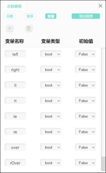 (3)變量頁面:機器人的變量面板,可對程序中的變量進行添加與修改。點擊“+”可對變量進行添加,點擊“刪除”可對選中變量進行刪除。變量類型有int(整數類型)、float(浮點數類型)、bool(布爾類型)、string(字符串類型)四種類型。同時可對變量名稱進行編輯,對變量類型進行選擇,對初始值進行手動輸入。