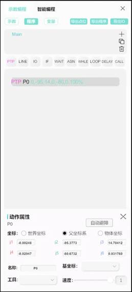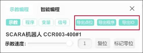 示教面板上方“導出點位”、“導出程序”“導出I0”按鈕,分別支持對當前點位表、程序、10的導出。