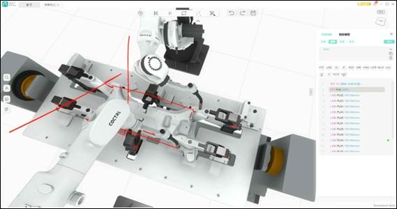 學生可通過示教完成產線的一部分程序編輯,通過智能編程完成工藝程序快速生成,再通過程序添加一系列邏輯(包括循環、多機器人調度等)進行整條產線的運動調度,實現整條產線多機器人模式下的仿真。