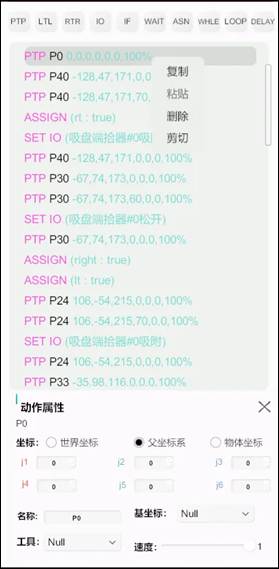 (2)程序頁面:機器人的程序面板包含:子程序列表、機器人的快捷指令,程序編輯面板以及相應的動作屬性。子程序為用戶提供了一種整理程序的方式,可進行創建、復制和刪除的操作,同時“CALL”語句可以實現對子程序的調用。在程序編輯面板中可對指令進行增刪改查操作,如下圖所示可進行程序的復制、粘貼、刪除、剪切操作,可通過按住某一行程序進行上下移的,來完成對程序面板上的程序進行調整順序的操作。