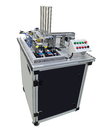 物料供給教學實訓平臺由PLC、移動型材工作臺、控制屏、多通道井式供料機、帶式傳輸機構、智能接口單元及控制面板、氣路控制裝置等組成。