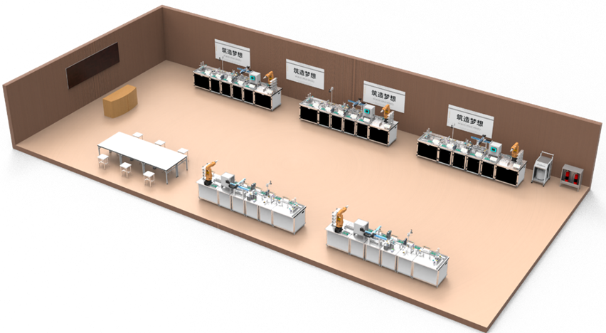 智能制造工業生產流水線教學實訓實訓室主要涉及在較為復雜環境下,運用所學的邏輯控制、順序控制等技能,實現小型自動化傳送系統的正常運行。通過對系統狀態分析,使學生在實訓環境中掌握 PLC程序編寫,觸摸屏編程,通訊和變頻器調試,系統診斷。同時還可進行高級語言編程、柔性生產、工廠數據分析、工藝優化、質量管理等智能制造相關的進階訓練科目內容。