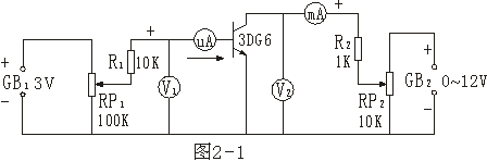 1、按圖2-1接線,V1用萬用表,V2用15V表頭,微安表用100μA表頭,三極管用3DG6。