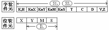 比較源S1與源S2的大小,目標地址D輸出相應的動作。大小比較是按代數(shù)形式進行的(-10<2)。所有源數(shù)據(jù)都被看成二進制值處理。目標地址D假如指定M0,則M1、M2被自動占用。