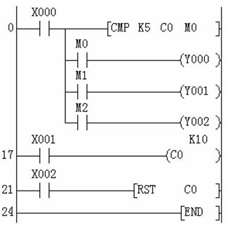 (4)例程說明:當計數(shù)器C0的值:小于5時,M0輸出ON;等于5時,M1輸出ON;大于5時,M2輸出ON。