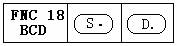 將源數(shù)據(jù)S(BIN)到目標地址D(BCD)轉(zhuǎn)換傳送指令。如BCD轉(zhuǎn)換結(jié)果超出0~9999范圍會出錯。在將可編程控制器內(nèi)的二進制數(shù)據(jù)變?yōu)槠叨物@示等的BCD碼而向外部輸出時使用。