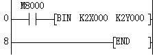 將源數(shù)據(jù)S(BCD)到目標地址D(BIN)轉(zhuǎn)換傳送指令。數(shù)值范圍:0~9999有效。在可編程控制器獲取BCD數(shù)字開關(guān)的設(shè)定值時使用。源數(shù)據(jù)不是BCD碼時會發(fā)生M8067(運算錯誤),M8068(運算錯誤鎖存)將不工作。因為常數(shù)L自動地轉(zhuǎn)換成二進制,所以不成為這個指令的源數(shù)據(jù)。