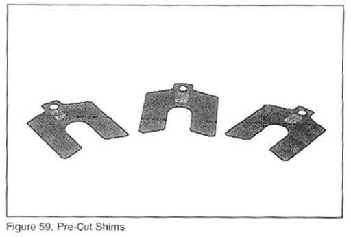 H.在電機的兩只腳下插入相應厚度的調整墊片(按步驟F中所計算出的墊片厚度),前兩只或者后兩只都可以,這樣可以使得軸上的水平儀氣泡處于中心位置。采用如圖59所示調整墊片,它們放在儲物柜的抽屜1中。