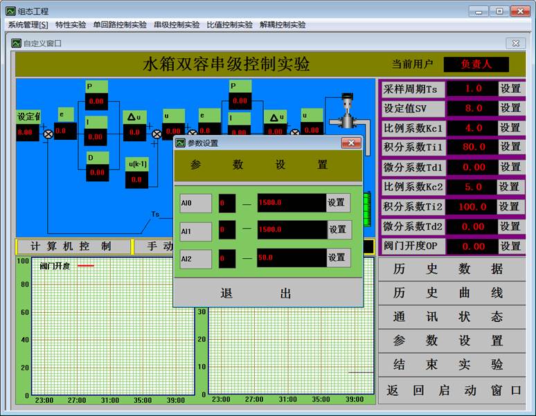 調節器的PID參數可以反復湊試,逐步逼近達到最佳的整定,實際中,采用串級調節系統是為了提高主被調量(下水箱)精度和改善動態特性而設置的,因此對副調回路的質量指標沒有要求。而對主回路的質量指標要求高。犧牲副回路的質量,保證主回路的調節質量。所以副調節器比例作用強一些,取消積分作用,主調節器設置P、I、D參數即可。
