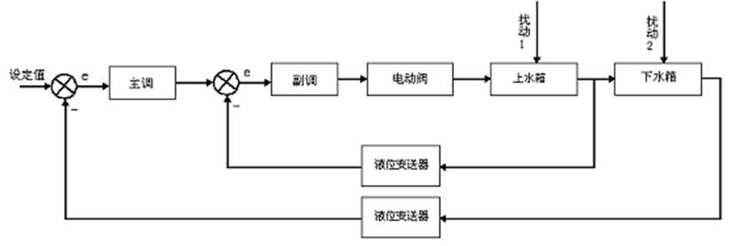 本實驗采用儀表控制,將上水箱液位控制在設定高度。串級回路是由內反饋組成的雙環控制系統,屬于復雜控制范疇。根據下水箱的液位信號輸出給儀表,作為主調節器輸入,主調節器的輸出作為副調節器的輸入,在串級控制系統中,兩個調節器任務不同,因此要選擇調節器的不同調節規律進行控制,副調節器主要任務是快速動作,迅速抵制進入副回路的擾動,至于副回路的調節不要求一定是無靜差。主調節器的任務是準確保持下水箱液位在設定值,因此,主調節器采用PI調節器也可考慮采用PID調節器。上下水箱雙容串級控制方塊原理圖如下: