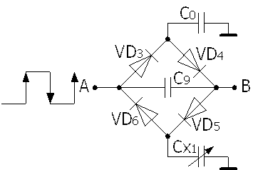 固定頻率的方波脈沖由A點輸入,在方波的上升沿,C0被充電,充電途徑是VD3→C0;與此同時,Cx1也被充電,其充電途徑是C9→VD5→Cx1。在方波的下降沿,C0和Cx1都放電,C0的放電途徑是C0→VD4→C9;Cx1的放電途徑是Cx1→VD6。由于C9在一個周期內的充電和放電平均電流分別為:IU=fVPCx1和ID=fVPC0,式中f是脈沖頻率,VP為方波峰值電壓,因此AB間的平均電流I=ID-IU=fVP(C0-Cx1)。從該式中可以看出電容的變化與AB間的電路成正比。