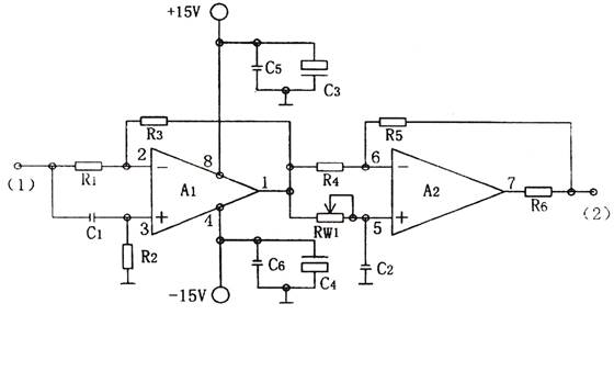 A1與C1、R2組成有源微分網絡,A2與RW1、C2組成有源積分網絡,當①端輸入天弦交流信號μm時,A1輸出一超前μm相位信號,A2輸出一滯后μm相位的信號,通過調節RW1可使輸出信號與輸入信號相位發生變化。