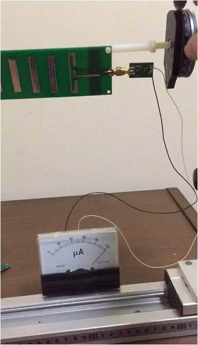5、用云臺(tái)轉(zhuǎn)盤(pán)將振子接收天線從水平方向旋轉(zhuǎn)5°到偏離水平方向5°。將旋轉(zhuǎn)云臺(tái)轉(zhuǎn)盤(pán)的手移開(kāi),盡量保持在采第一個(gè)點(diǎn)時(shí)的環(huán)境狀態(tài),減少環(huán)境對(duì)實(shí)驗(yàn)的干擾。獲取振子天線偏離水平方向5°時(shí),振子接收天線接收到的微安表強(qiáng)度,