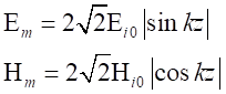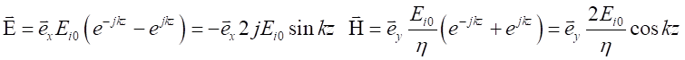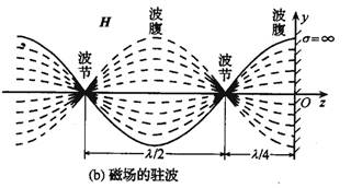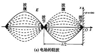由上式可以看到,z≤0空間中的合成波具有如下特點電場強度和磁場強度的振幅不再是常量,沿波的傳播方向按正弦函數或余弦函數分布,即在kz=-np,也就的點上,電場強度的振幅為零。這些點稱為電場強度的波節點。在也就是的點上,電場強度的振幅值達到最大值2Ei0,它是入射波電場強度振幅值Ei0的2倍,這些點稱為電場強度的波腹點。在這些點上,磁場強度的振幅為零。這些點是磁場強度的波節點。在其它點上,電場和磁場的振幅介于零和最大值2Ei0或2Ei0/h之間。相鄰的兩個波節點或波腹點之間的距離是半個波長;而相鄰的波腹點和波節點之間的距離是1/4波長。電場強度和磁場強度的波節點和波腹點之間的距離是1/4波長。電場強度和磁場強度的波節點和波腹點的位置不隨時間改變。