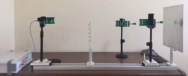 然后將天線按照發射天線的極化方式,調整相應的擺放方向,調整天線與電場的關系,使得電場在天線上激起較強的感應電流,繼而通過電路轉換為相應的電壓。在實驗臺上通過不斷調整感應裝置的位置,觀察檢測電壓的變化規律,通過尋找極大值和極小值的方式測量極值之間的距離,通過預設電磁波頻率推算出相應的波長的理論值與測試值作對比,來驗證理論和實驗的一致性。