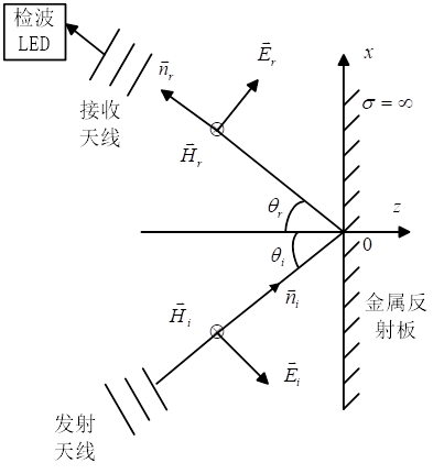 反射波電場強度由理想導體表面上的電磁場邊界條件決定。在理想介質和理想導電體的分界面,z=0平面上,由邊界條件得合成波的電場強度應當為零。
