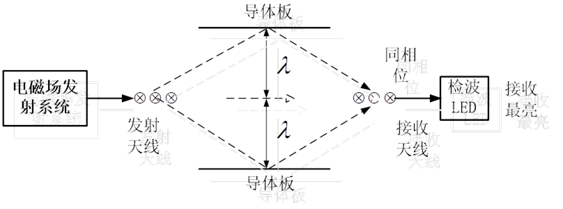 變化的電場和磁場在空間的傳播稱為電磁波,幾列電磁波同時在同一介質中傳播時,幾列波可以保持各自的特點(波長、振幅、頻率、傳播方向等) ,同時通過媒質,在幾列波相遇或疊加的區域內,任一點的振動為各個波單獨在該點產生的振動的合成。而當兩個頻率相同、振動方向相同、相位差恒定的波源所發出的波的疊加時在空間總會有一些點振動始終加強,而另一些點振動始終減弱或完全抵消,因而形成干涉現象,而駐波是干涉的特例。在同一介質中兩列振幅相同的相干波,在同一直線上反向傳播時就疊加形成駐波。此平面波垂直入射到金屬板,被金屬板反射回來,到達電磁波感應器;直射波也可直接到達電磁波感應器。這兩列波將形成駐波,兩列電磁波的波程差滿足一定關系時,在感應器位置可以產生波腹或波節。