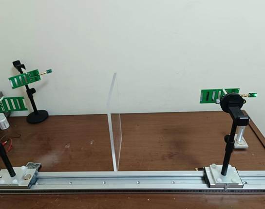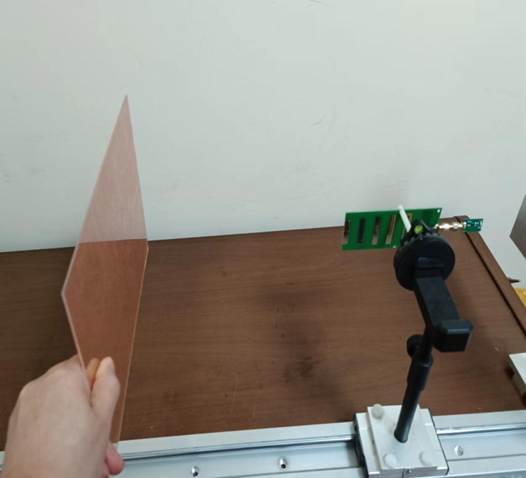 6)將有機玻璃平面放入收發天線中間,觀察LED燈的變化。