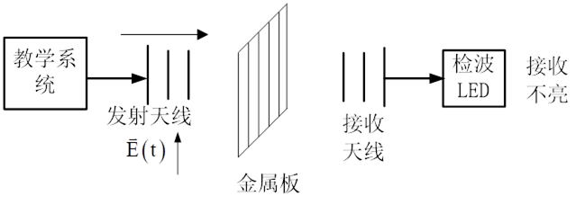 4)將平面金屬板放入收發天線中間,如圖4所示,電磁場不能穿投導體板,按下發射開關,此時電磁波發射出來,觀察LED燈是否被點亮。LED燈不亮。說明電磁波被導體板屏蔽了。
