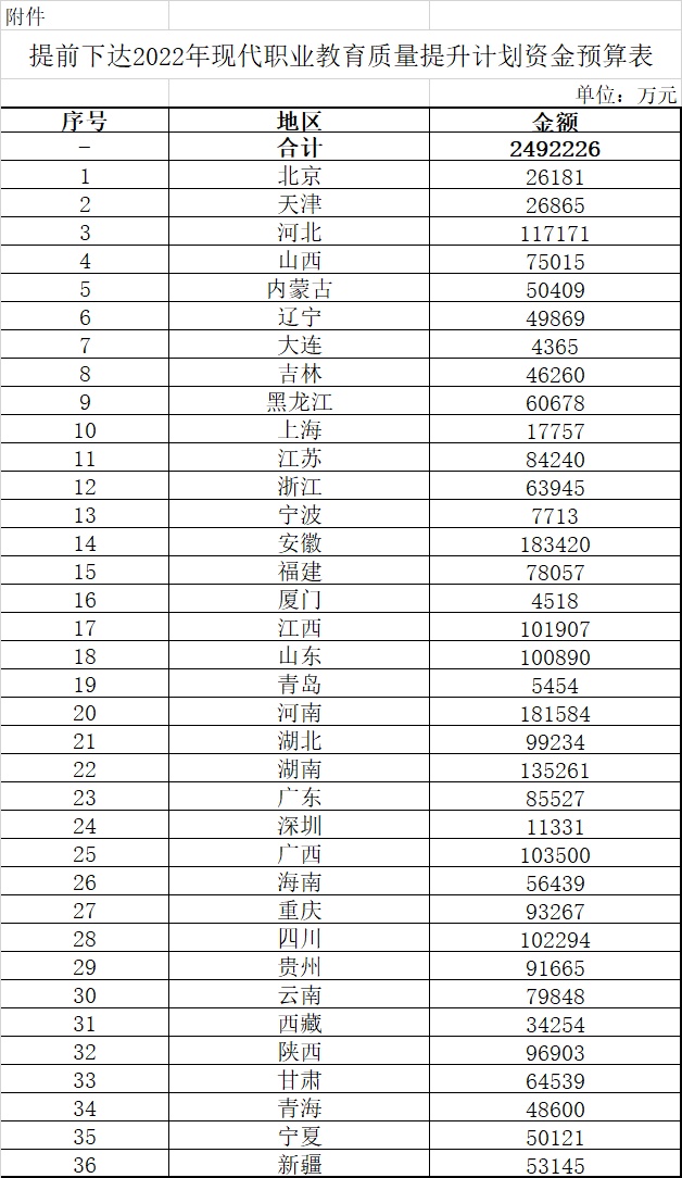 為加快預(yù)算執(zhí)行進度,提高預(yù)算編制的完整性,現(xiàn)提前下達(dá)你省(自治區(qū)、直轄市、計劃單列市,下同)2022年現(xiàn)代職業(yè)教育質(zhì)量提升計劃資金預(yù)算(項目代碼:Z135050009055),詳見附件。收入列2022年政府收支分類科目“1100245教育共同財政事權(quán)轉(zhuǎn)移支付收入”,支出列“205教育支出”相關(guān)項。待2022年預(yù)算年度開始后,按程序撥付使用。現(xiàn)將有關(guān)事項通知如下: