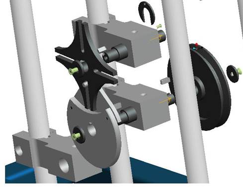 機構說明:槽輪機構動力性能較差,但若將一個導桿機構串聯在槽輪的機構之前,則可改善槽輪機構的動力性能。