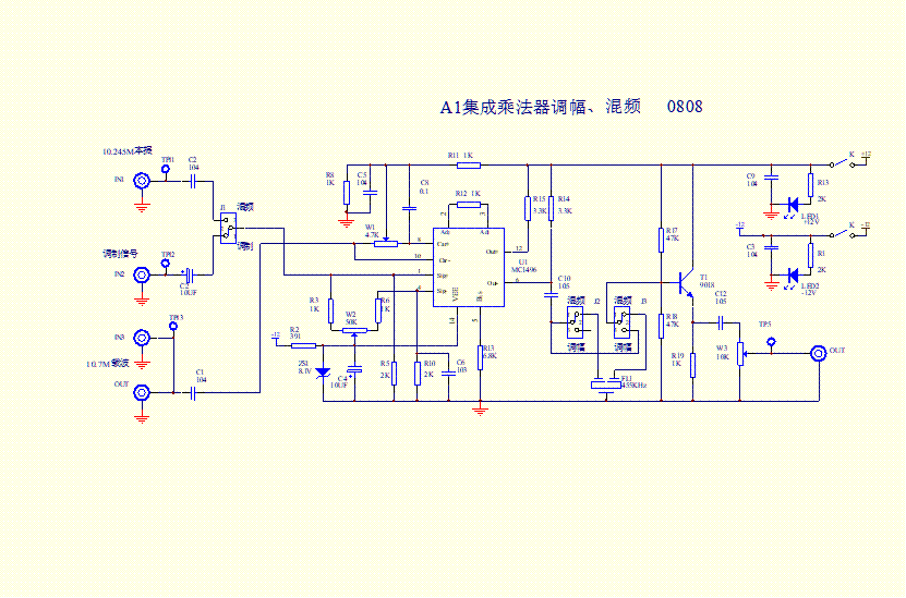 當(dāng)進(jìn)行集成乘法器混頻實(shí)驗(yàn)時(shí),把J2、J3、J5、J8、J9上的跳線塊置于1-2位置,將J1上的跳線塊改插于2-3位置,(J4、J6、J7不插跳塊);IN1、IN3分別輸入10.245 MHz與10.7MHz高頻正弦波,IN2空閑。