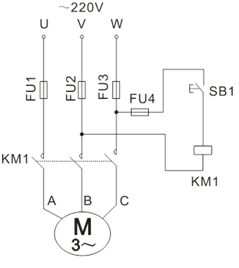 按圖5-6接線。圖中SB1、KM1、FU1、FU2、FU3、FU4為掛件GDQ39-1上的器件,電機(jī)選用DQ10(△/220V)。接線時(shí),先接主電路,它是從220V三相交流電源的輸出端U、V、W開(kāi)始,經(jīng)熔斷器FU1、FU2、FU3、接觸器KM1主觸點(diǎn)到電動(dòng)機(jī)M的三個(gè)線端A、B、C的電路,用導(dǎo)線按順序串聯(lián)起來(lái),有三路。主電路經(jīng)檢查無(wú)誤后,再接控制線路,從熔斷器FU4插孔W開(kāi)始,經(jīng)按鈕SB1常開(kāi)、接觸器KM1線圈到插孔V。線路接好經(jīng)指導(dǎo)老師檢查無(wú)誤后,按下面步驟進(jìn)行實(shí)訓(xùn):