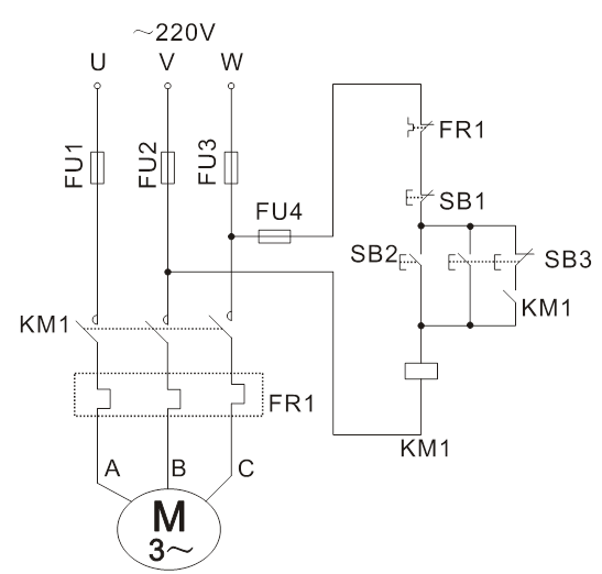 按下控制屏上“停止”按鈕切斷三相交流電源后,按圖5-8接線,圖中SB1、SB2、SB3、KM1、FR1、FU1、FU2、FU3、FU4為掛件GDQ39-1上的器件,電機(jī)選用DQ10(△/220V)。