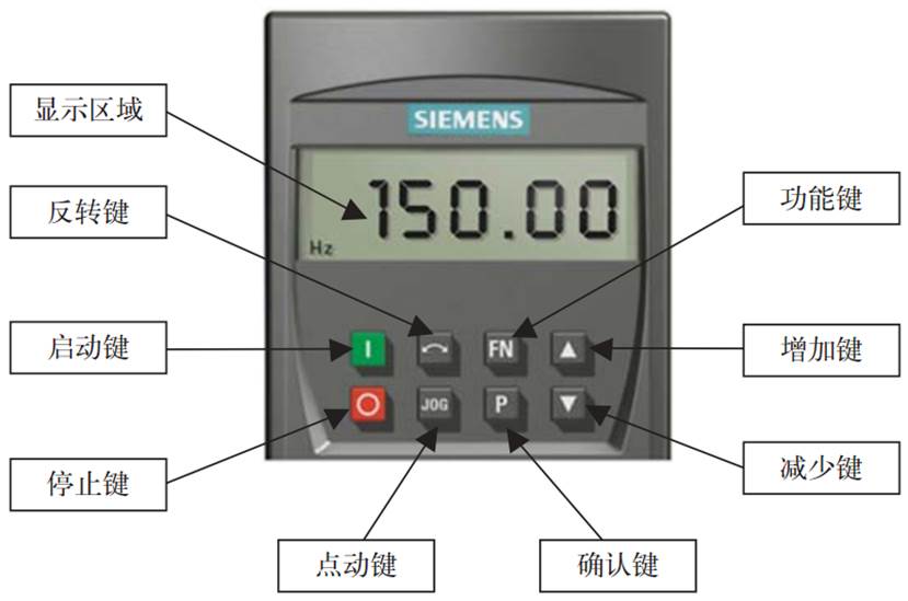 利用變頻器的操作面板和相關(guān)參數(shù)設(shè)置,即可實現(xiàn)對變頻器的某些基本操作如正反轉(zhuǎn)、點動等運行。變頻器面板的介紹及按鍵功能說明如下圖,具體參數(shù)號和相應(yīng)功能參照系統(tǒng)手冊。