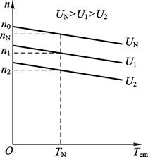 改變電樞電壓調速是指在他勵直流電動機中,由一可調節的直流電源向電樞供電,在其他參數不變的條件下,通過調節直流電源來改變電樞電壓U,使空載轉速n0改變,從而使電動機拖動負載運行于不同的轉速,如圖2-20所示。