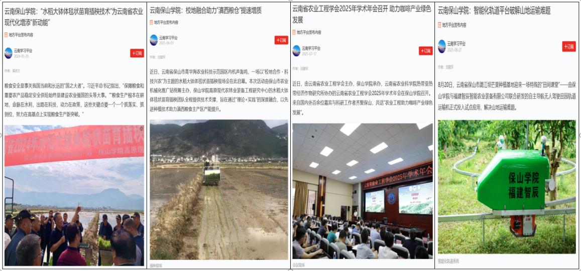 學院立足云南區(qū)位優(yōu)勢與學科特色,堅持“科研從地方中來,成果到地方中去”,構建起多層次、寬領域的社會服務體系。聚焦云南高原特色農業(yè)、地質災害防治、礦產資源、鄉(xiāng)村振興等領域,推動科研成果落地轉化。劉建軍博士團隊的“云南高原水稻大缽體毯狀苗育插秧及全程機械化技術”得到省級推廣,研發(fā)的“小型煙稈清運機”推動農業(yè)裝備現(xiàn)代化,助力鄉(xiāng)村振興與產業(yè)升級;李倩博士團隊開展的國家自然基金項目“騰沖新生代火山起源的深部動力學數(shù)值模擬”,拓展了地球物理前沿研究;蔣玉副教授團隊圍繞“泥石流堆積體作為再生混凝土可行性研究”,深化地質災害防治與資源化利用;許艷副教授團隊開展“國寶永子”及其原礦顯微特征與振動光譜研究,助力本土文化資源保護與開發(fā);張潔團隊深耕滇西片區(qū),以“產教融合”模式從公共空間延伸到鄉(xiāng)村文旅推動鄉(xiāng)土實踐。學院的產教融合相關工作4次被“學習強國”報道。